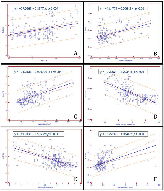 Correlation between global longitudinal strain and cardiac MRI-derived tissue and functional parameters in a patient cohort: GLS vs. (A) extracellular volume (ECV, %), (B) native T1 mapping (ms), (C) left ventricular mass index (LVMi, g/m), (D) global left ventricular torsion (°/cm), (E) peak diastolic LV torsion (°/cm), (F) peak systolic LV torsion (°/cm).