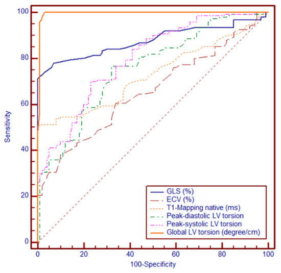 In this study, we assessed LV deformation and torsion parameters using CMR-FT in patients with HCM. Our findings confirm that, despite preserved LVEF, patients with HCM exhibit significant impairment in GLS, GCS, GRS, and LV torsion, indicating subclinical myocardial dysfunction. Moreover, the ROC analysis demonstrated that global LV torsion provided significantly superior discriminatory power compared with GLS, native T1, and ECV, suggesting its potential as a robust diagnostic marker. These results reinforce existing evidence that conventional measures such as LVEF may underestimate early myocardial impairment in HCM [18,20].