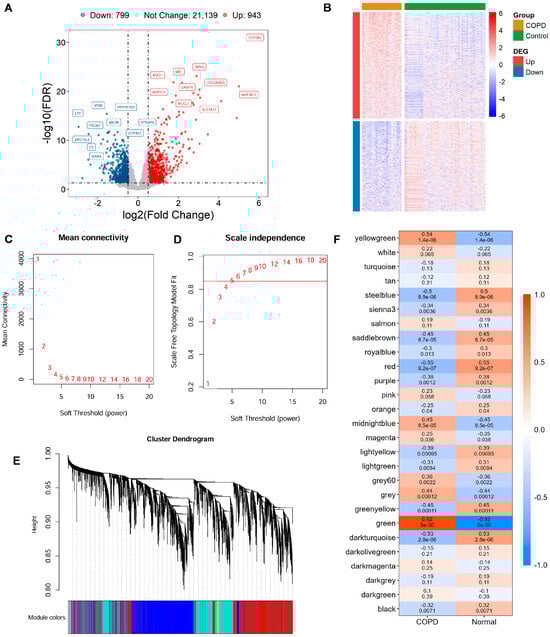Gene expression differences and module identification by WGCNA. (A) Differentially expressed genes (DEGs) are visualized through volcano diagram, with red indicating upregulated genes, sky blue for downregulated genes, and gray for genes showing no significant expression change. (B) Expression patterns of significantly altered DEGs in COPD vs. controls are shown in a heatmap, with red indicating high expression and blue indicating low expression. (C,D) The scale-free topology fit index is assessed across various soft-thresholding powers (β). A soft-thresholding power of 5 is selected, as it first achieves an R2 > 0.85, which is considered optimal. (E) Original and merged modules are depicted beneath the clustering dendrogram. (F) Heatmap of module–trait relationships is presented, where each cell displays both the correlation coefficient and its corresponding p-value.