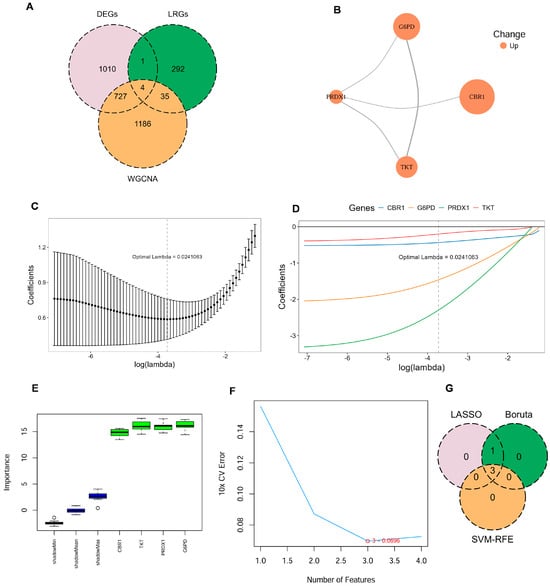 Identification of key LRG signatures in COPD. (A) Venn diagram illustrates the overlap between DEGs, genes identified by WGCNA, and LRGs. (B) Protein–protein interaction (PPI) network for the candidate genes, constructed using the STRING database, with node color indicating upregulated expression. (C,D) Ten-fold cross-validation in least absolute shrinkage and selection operator (LASSO) regression model determined the optimal penalty coefficient (λ = 0.024). (E) Gene importance scores of candidate genes evaluated by the Boruta algorithm, with green boxes indicating significantly confirmed genes. (F) Ten-fold cross-validation error rates under different feature numbers in the support vector machine–recursive feature elimination (SVM–RFE) algorithm, showing the lowest error when the number of features is three. (G) Venn diagram illustrating the commonly confirmed key feature genes among the results of the three algorithms.