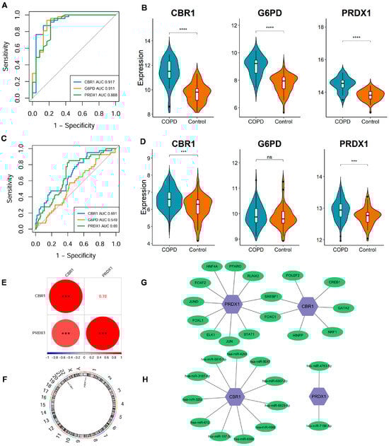 Expression differences, diagnostic performance, and regulatory network analysis of LRG signature genes. (A,B) ROC curve analysis and expression level comparison in the discovery dataset (GSE21359). **** p < 0.0001. (C,D) ROC curves and expression level analyses in the validation dataset (GSE76925). *** p < 0.001; ns, not significant. (E) Spearman correlation analysis of CBR1 and PRDX1 expression levels in the discovery dataset. Red and blue circles represent positive and negative correlations, respectively, with size reflecting the coefficient. *** p < 0.001. (F) Genomic localization of key genes. CBR1 and PRDX1 are located on chromosomes 22 and 1, respectively. (G) The transcription factor (TF)–mRNA regulatory network of CBR1 and PRDX1. (H) The miRNA–mRNA regulatory network of CBR1 and PRDX1.