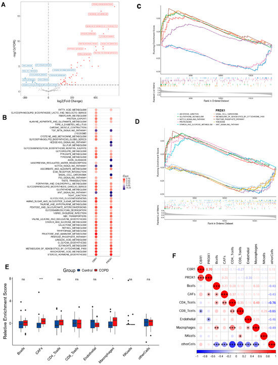 Functional enrichment and immune microenvironment analysis combined with LRG signatures in COPD. (A) Volcano plot of differential pathways identified by gene set variation analysis (GSVA) between the COPD and the control groups. Pathways upregulated in the COPD group are shown in red, while those downregulated are shown in blue. (B) Correlation analysis between CBR1 and PRDX1 and significantly enriched the KEGG pathways. Circle color indicates the direction of the correlation, with red representing positive and blue indicating negative correlations. Circle size reflects the strength of the correlation. (C,D) GSEA results for CBR1 and PRDX1 showing the top five significantly enriched signaling pathways for each gene. (E) Immune cell infiltration differences in the COPD and the control groups. (F) Heatmap of the correlation between gene expression (CBR1 and PRDX1) and immune infiltration, with red indicating positive and blue negative correlations. * p < 0.05; ** p < 0.01; *** p < 0.001; ns, not significant.