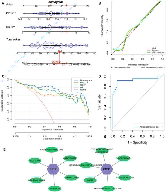 Clinical nomogram and drug screening analysis based on the LRG signatures. (A) A nomogram was developed using the expression levels of CBR1 and PRDX1 to evaluate individual risk for the development of COPD. (B) Strong agreement was observed between predicted and actual probabilities in the calibration curve. (C) Decision curve analysis (DCA) highlighted its clinical benefit over various risk thresholds. (D) The nomogram’s receiver operating characteristic (ROC) curve showed an area under the curve (AUC) of 0.926, indicating excellent diagnostic performance. (E) A potential drug–gene interaction network related to CBR1 and PRDX1. In the figure, purple hexagonal nodes represent the key genes (CBR1 and PRDX1), while green elliptical nodes indicate the corresponding transcription factors, miRNAs, or drug molecules. * p < 0.05; ** p < 0.01.