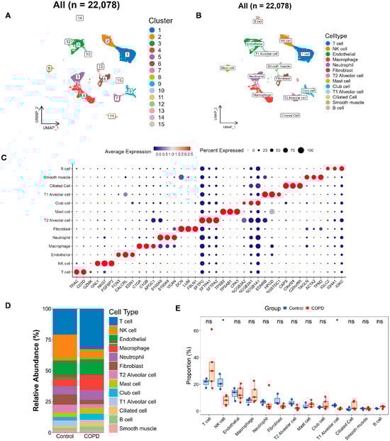Single-cell atlas and cell–cell communication in COPD. (A,B) The Uniform Manifold Approximation and Projection (UMAP) clustering (A) and annotation (B) of 22,078 single cells into 15 clusters and 13 major cell types, respectively. (C) Bubble plot depicting marker gene expression, where color reflects average expression and dot size indicates the proportion of cells expressing each gene. (D,E) Bar and box plots illustrating the relative abundance of each cell type in the COPD and the control groups. The bar plot (D) highlights compositional changes across conditions, while the box plot (E) presents statistical comparisons of cell-type proportions (two-tailed Wilcoxon test; * p < 0.05; ns, not significant).