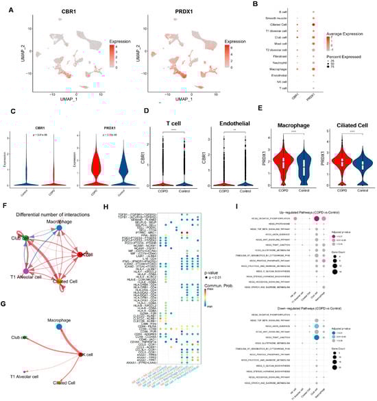 Cell-type-specific expression and intercellular communication features of CBR1 and PRDX1 in COPD. (A) UMAPs depicting the single-cell expression profiles of CBR1 and PRDX1 across all cells. (B) Bubble plots illustrating average expression and proportion of cells expressing CBR1 and PRDX1 across major cell types. (C) Violin plots showing a significantly elevated expression of CBR1 and PRDX1 in COPD compared with the controls (two-tailed Wilcoxon test). (D) Cell-type-specific upregulation of CBR1 in T cells and endothelial cells. (E) Cell-type-specific upregulation of PRDX1 in macrophages and ciliated epithelial cells. (F,G) Altered cell–cell communication networks in COPD, highlighting increased interaction frequencies involving macrophages, NK cells, club cells, and ciliated cells. (H) Dot plot of differentially regulated ligand–receptor interactions in COPD across key cell types; dot size indicates interaction strength, and color denotes adjusted p-value. (I) KEGG pathway enrichment analysis of ligand-expressing cells, showing upregulated (top) and downregulated (bottom) pathways in COPD; dot size reflects gene count, and color represents significance. Statistical significance is denoted by ** (p < 0. 01) and **** (p < 0.0001).