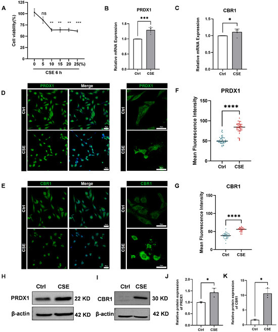 Subsequently, qRT-PCR analysis showed pronounced upregulation of PRDX1 and CBR1 mRNA in BEAS-2B cells after 6 h of 5% CSE treatment (Figure 8B,C). Immunofluorescence staining further validated these findings, revealing increased fluorescence intensity of PRDX1 and CBR1 proteins following CSE exposure (Figure 8D–G). To further validate these findings at the protein level, Western blot analysis was performed, revealing a markedly elevated expression of both PRDX1 and CBR1 in CSE-treated BEAS-2B cells compared with the controls (Figure 8H–K). These results were in strong concordance with the qRT-PCR and immunofluorescence data, collectively confirming that CSE exposure induces robust upregulation of PRDX1 and CBR1 at both the transcriptional and translational levels under oxidative stress conditions. Notably, PRDX1, a crucial thioredoxin peroxidase, is likely upregulated to mitigate hydrogen peroxide induced by CSE and maintain intracellular oxidation–reduction balance. The synchronized upregulation of CBR1 suggests the activation of the NADPH-dependent aldehyde reductase system, potentially involved in the metabolic clearance of lipid peroxidation products (such as 4-HNE), thus providing cellular protection under oxidative stress conditions. Therefore, this study successfully demonstrates that CSE significantly activates the antioxidant defense system mediated by PRDX1 and CBR1, revealing compensatory protective mechanisms initiated in airway epithelial cells during smoking-induced oxidative stress.