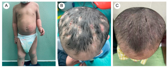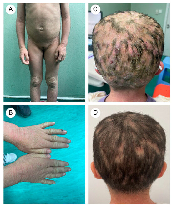 A five-year-and-eight-month-old Chinese girl presented with generalized pustules on the scalp accompanied by multifocal alopecia. Her medical history revealed erythematous vesicles and desquamation at birth, followed by progressive development of keratotic plaques with scaling across the entire body. Flexural areas exhibited friction-induced erosions. Through physical examination, the patient displayed xerosis, widespread erythematous scaly patches, and hyperkeratosis localized to the knees, elbows, dorsal hands, and feet. Additionally, scattered erosions and crusted lesions were observed on the trunk and flexural areas (Figure 1A,B). The scalp exhibited diffuse suppurative papules with patchy alopecia (Figure 1C). Immunological profiling revealed abnormalities, including elevated white blood cell count (16.01 × 109/L, reference range: 4.00–12.00 × 109/L) and increased absolute neutrophil count (10.60 × 109/L, reference range: 1.50–7.80 × 109/L), with normal eosinophil percentages.