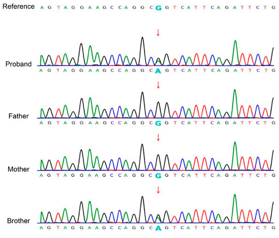 Sanger sequencing was used to confirm the candidate mutations identified during WES. The amplified PCR products were purified using a QIAQuick PCR purification kit (QIAGEN, Hilden, Germany) and directly sequenced on an ABI PRISM3730XL automated sequencer (Applied Biosystems, Thermo Fisher Scientific, Waltham, MA, USA). The Chromas v2.6.6 was used to display the signal for each base site. Each base is represented using a different color, and the height of the peak indicates the signal intensity of the base.