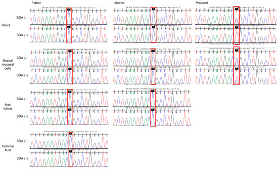 This identical mutation in siblings with different fathers suggested maternal germline mosaicism. We further screened parental samples for mosaicism using the BDA method, which prevents false positives from pseudogene interference. BDA-based Sanger sequencing demonstrated wild-type peaks at the c.466 site in both BDA (+) and BDA (−) groups across blood, buccal mucosal cells, hair follicles, and seminal fluid samples, with no difference in signal intensity between groups (Figure 4).