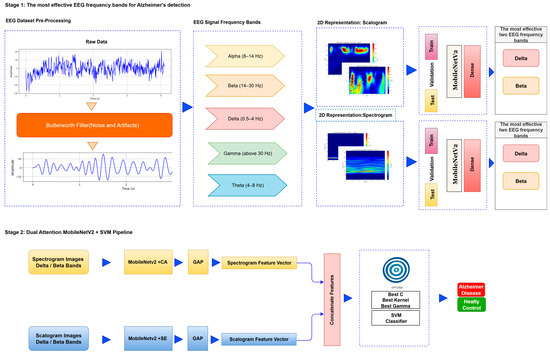 The deep learning approach proposed for image-based analysis of Alzheimer’s disease consists of a series of systematic stages. First, preprocessing operations such as denoising and artifact cleaning are applied to the EEG signals to transform the raw data into a form suitable for analysis. This stage is followed by transforming the signals. Signals are transformed into time–frequency representations that reveal the dynamic properties of the signals by combining the time and frequency dimensions. This transformation is carried out by methods such as FT and CWT. The obtained time–frequency representations are divided into training, validation, and test data sets for the purpose of training, validation, and testing the deep learning model. Finally, these data sets are provided as input to a lightweight deep learning model. In the first stage, the most relevant EEG frequency bands for Alzheimer’s diagnosis are identified, allowing the analysis to focus solely on the most informative components rather than processing the entire dataset. In the second stage, features are extracted from these selected bands using a lightweight, frozen neural network integrated with attention mechanisms, and subsequently classified using an optimized SVM. The flow chart of the proposed model is presented in Figure 1.