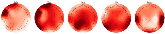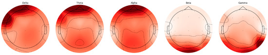EEG signals are divided into five basic frequency bands: Delta, Theta, Alpha, Beta, and Gamma [22]. The Delta band covers frequencies below 4 Hz, representing deep sleep and slow wave activities. The Theta band is in the range of 4–8 Hz and is associated with light sleep and relaxation states. The Alpha band reflects states of wakefulness, relaxation, and concentration in the range of 8–14 Hz. The Beta band is associated with active thinking, cognitive processes, and motor activities in the range of 14–30 Hz, while the Gamma band covers frequencies above 30 Hz and represents higher cognitive processes. The distributions of frequency bands on the scalp were evaluated separately for AD and HC, and topographic maps were created using the Welch method. The Weltch method calculates each channel’s power spectral density (PSD) in the specified frequency band. It draws a topographic map using each frequency band’s average PSD values and channel positions. These maps visualize the activity intensities of different frequency bands in the brain and are presented in Figure 2 and Figure 3.