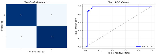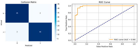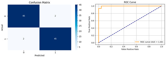 The performance metrics in Table 6 demonstrate the effectiveness of combining the features obtained using Delta and Beta frequency bands with the MobileNetV2 model and the SVM classifier. This approach combined the strengths of both frequency bands to obtain robust classification results. The complexity matrix and ROC for Delta + Beta joint features using MobileNetV2 and SVM are presented in Figure 4.