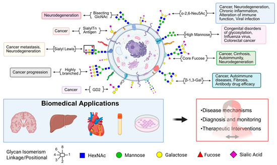 Glycans play critical roles in maintaining health and are involved in the pathogenesis of various diseases. This schematic illustrates the diverse glycan structures present on the cell surface and their associations with specific biological processes and disease states. Structural motifs such as bisecting GlcNAc, sialyl Lewis antigens, high-mannose glycans, core fucose, and highly branched glycans are linked to cancer progression, metastasis, neurodegeneration, autoimmune disorders, and infectious diseases. Altered glycosylation patterns serve as biomarkers and therapeutic targets, influencing immune recognition, cell adhesion, signaling, and drug efficacy. Biomedical applications of glycomics include uncovering disease mechanisms, enhancing diagnosis and monitoring, and guiding therapeutic interventions across tissues and biological systems.