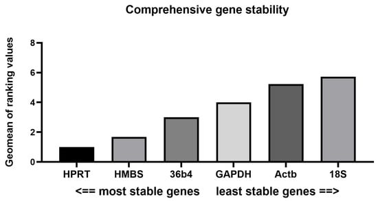 In confirmation of the results obtained so far, the ReFinder tool also highlighted HPRT as the most stable gene (geomean rank = 1), followed by HMBS (1.68) and 36B4 (3). These genes demonstrated consistent performance across the applied evaluation methods and thus could be recommended for reliable normalization (Figure 2).