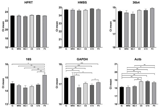 Inter-group statistical comparison of raw Ct values for selected reference genes (HPRT, HMBS, 36B4, 18S, GAPDH, and Actb) in mature 3T3-L1 adipocytes treated with 10% (v/v) cell-free supernatants from L. paracasei strains. Abbreviations: IC—untreated, induced control; MRS—induced control, treated with MRS; M2.1, C8, C15, P4—experimental groups, induced and treated with supernatants for 48 h. Data are presented as mean ± SEM of six biological replicates per group (n = 6). Statistical analyses and visualization were performed in GraphPad Prism (v.10). Inter-group variability was first assessed by one-way ANOVA, and genes showing statistically significant differences were further analyzed using Student’s t-test to confirm the significance level, as follows: * p < 0.05; ** p < 0.01; *** p < 0.001.