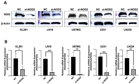 The Western blot analysis confirmed a successful NOD2 protein reduction across all transfected GBM cell lines (GL261, LN18, U87 MG, U251, and LN229) (Figure 3A). The quantitative real-time PCR analysis further validated the knockdown efficiency at the transcriptional level (Figure 3B).