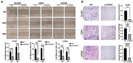 Beyond proliferative effects, NOD2 silencing profoundly impacted the cellular motility and invasive behavior. Wound healing migration assays demonstrated a significant impairment of the migratory capacity in NOD2-depleted cells across all three cell lines tested (Figure 5A). Transwell invasion assays revealed that the NOD2 knockdown substantially diminished the invasive potential of LN229, U251, and GL261 cells (Figure 5B).