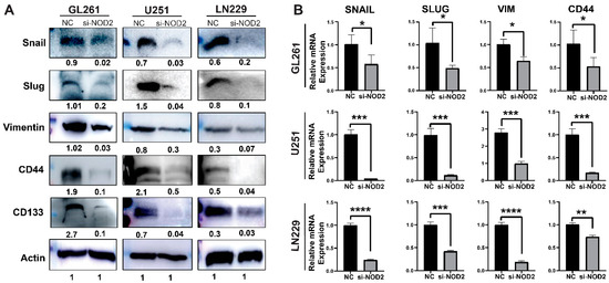 NOD2 knockdown-mediated suppression of aggressive behavior associates with reduced EMT and CSC features. (A) Western blot analysis demonstrated that siRNA-mediated NOD2 knockdown (siNOD2) significantly reduced protein expression levels of EMT markers (Snail, Slug, Vimentin) and CSC markers (CD44 and CD133) compared to scrambled control (NC) treatment. (B) Quantitative real-time PCR (qRT-PCR) analysis corroborated these findings, confirming decreased mRNA expression of EMT markers (Snail, Slug, Vimentin) and the stemness marker CD44 following NOD2 knockdown relative to scrambled controls (NCs) (*, p < 0.05; **, p < 0.01; ***, p < 0.001; ****, p < 0.0001).