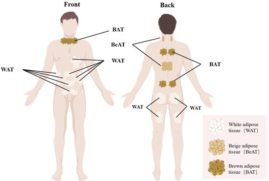Beyond the classical classifications of white and brown adipose tissues, a distinct third adipocyte population, termed beige adipose tissue, has been characterized. These adipocytes are predominantly situated within subcutaneous fat depots, notably in the paravertebral and supraclavicular regions. Although histologically indistinguishable from brown adipocytes, beige adipocytes exhibit physiological properties similar to white adipocytes under basal conditions, demonstrating limited thermogenic activity [38]. Importantly, exposure to cold environments and physical exercise can trigger the transdifferentiation of white adipocytes into beige adipocytes through a process referred to as “browning,” during which the cells acquire morphological and metabolic features characteristic of brown fat [39]. Upon exposure to reduced ambient temperatures, beige adipocytes can promptly and dynamically activate thermogenic pathways via adaptive responses, thereby enhancing energy expenditure. Notably, once the browning stimulus is removed, beige adipocytes swiftly revert to their white adipose state [40]. Consequently, beige adipocytes represent a promising therapeutic target for obesity by promoting increased energy dissipation. The anatomical distribution of adipose tissue within the human body is illustrated in Figure 1.
