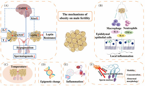 The impact of obesity on male fertility. (A) Obesity has significant implications for male fertility, primarily through several physiological mechanisms. Adipose tissue elevates CYP19 in adipocytes, enhancing testosterone (T) conversion to estradiol (E2). This negative feedback on the hypothalamic–pituitary–testicular (HPT) axis potentially causes gonadal dysfunction. In addition, long-term elevated levels of leptin in obese males lead to leptin resistance, decreased Kiss expression, and reduced stimulation of GnRH neurons. A decrease in GnRH leads to male hypogonadism and spermatogenesis disorders. (B) Macrophages, neutrophils, and inflammatory mediators in adipose tissue infiltrate the epididymal lumen, leading to increased cytokine (IL-1, IL6, and TNF-α) expression and epithelial cell apoptosis, which in turn affect sperm maturation and the fertilization process. (C) Obesity is associated with increased local temperature in the scrotum, which adversely affects male fertility. (D) The quality of sperm is also compromised by obesity through epigenetic modifications. (E) Obesity disrupts the gut microbiota, leading to testicular inflammation and subsequent damage to sperm quality. (F) Elevated levels of reactive oxygen species (ROS) can adversely affect sperm mitochondria and nuclei, leading to decreased sperm motility and concentration, as well as an increased prevalence of abnormally shaped sperm.