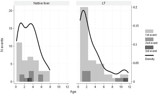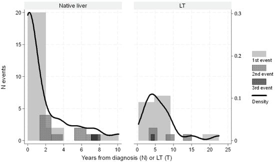 Distribution of number of varices as first or subsequent episodes by years from diagnosis or transplantation. The overlapped black line indicates the Kernel density function.