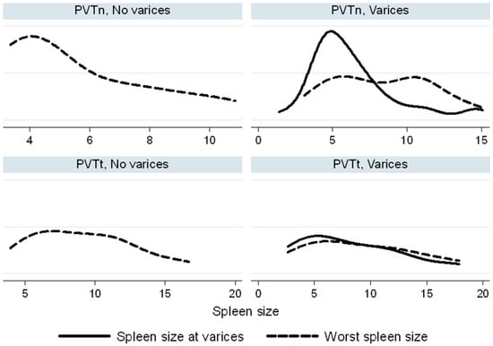 Spleen length (cm) in PVT and PVTn patients. Worst spleen measurements (dashed lines) were compared to spleen sizes at the time of varices (continuous lines). The Kernell density function is used to smooth the distribution of spleen sizes.