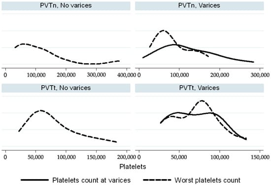 Platelet count (×103/L) in PVT and PVTn patients. Worst platelet count (dashed lines) was compared to platelet count at the time of varices (continuous lines). The Kernell density function is used to smooth the distribution of platelet count.