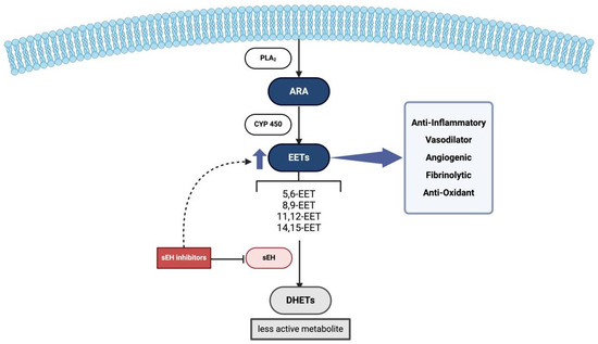 Arachidonic acid (ARA), eicosapentaenoic acid (EPA), docosapentaenoic acid (DPA), and linoleic acid are all polyunsaturated fatty acids (PUFAs). The cytochrome P450 (CYP450) enzyme system metabolizes these PUFAs into various epoxy and hydroxy derivatives: it generates epoxyeicosatrienoic acids (EETs) and hydroxyeicosatetraenoic acids (HETEs) from ARA, epoxyeicosatetraenoic acids (EEQs) from EPA, epoxydocosapentenoic acids (EDPs) from DHA, and epoxyoctadecenoic acids (EpOMEs) from linoleic acid [43,44]. Collectively, these CYP450-derived metabolites are referred to as epoxy-fatty acids (EpFAs). While products of cyclooxygenase (COX) and lipoxygenase (LOX) pathways typically exhibit pro-inflammatory properties, EpFAs are known for their anti-inflammatory effects [25]. Functioning as autocrine and paracrine lipid mediators, EpFAs are rapidly hydrolyzed by epoxide hydrolases (EHs), primarily soluble epoxide hydrolase (sEH), into their corresponding diols [45]. Focusing on ARA-derived EpFAs, EETs exist as four regioisomers: 14,15-EET, 11,12-EET, 8,9-EET, and 5,6-EET, with 14,15-EET being the most abundant and exhibiting the highest affinity for sEH [46]. EETs are hydrolyzed by EHs into their less biologically active dihydroxyeicosatrienoic acid (DHET) metabolites [44].
