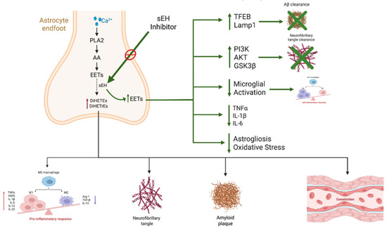 The role of epoxide hydrolase (sEH) inhibitors in the pathogenesis of Alzheimer’s disease pathology. AA, released via PLA2 from astrocytes, is metabolized into EETs, which exert anti-inflammatory and vasoprotective effects. sEH hydrolyzes EETs into diols (DiHETrEs and DiHETEs), which are pro-inflammatory. sEH inhibitors stabilize EETs, leading to: (1) activation of TFEB and LAMP1, thereby enhancing Aβ clearance; (2) modulation of the PI3K/AKT/GSK3β pathway, limiting tau hyperphosphorylation; (3) suppression of microglial activation and pro-inflammatory cytokines (TNF-α, IL-1β, IL-6), thus reducing neuroinflammation; and (4) attenuation of astrogliosis and oxidative stress, thereby promoting neuroprotection. Collectively, these actions help mitigate neurofibrillary tangle formation, amyloid plaque accumulation, vascular dysfunction, and cognitive decline. Abbreviations: PLA2—phospholipase A2; AA—arachidonic acid; EETs—epoxyeicosatrienoic acids; DiHETrEs—dihydroxyeicosatrienoic acids; TFEB—transcription factor EB; LAMP1—lysosomal-associated membrane protein 1.