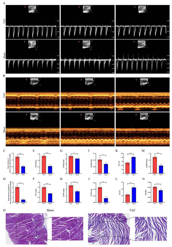 Four weeks after surgery, mice were anesthetized with an inhalational anesthetic, and their heart rates were continuously monitored and maintained within the range of 400 to 500 beats per minute. Echocardiographic assessments were performed by technicians who were blinded to the experimental groups, utilizing a high-frequency ultrasound system attached to the images of the small animal (Mylab X5 Vet, BersinBio, Guangzhou, China). Standard echocardiographic views, including the left ventricular long-axis, short-axis, and aortic arch views, were systematically acquired. Key measurements included the following: ejection fraction (EF), fractional shortening (FS), the interventricular septum diastolic thickness (IVS.d), interventricular septum systolic thickness (IVS.s), left ventricular internal diameter in diastole (LVID.d), left ventricular internal diameter in systole (LVID.s), left ventricular end-diastolic volume (LVEDV), left ventricular end-systolic volume (LVESV), and left ventricular posterior wall diastolic thickness (LVPWD). For the TAC and sham groups, statistical significance was evaluated using an unpaired Student’s t-test performed with the SPSS software (version 26.0; SPSS Inc., Chicago, IL, USA). A p-value < 0.05 was considered to indicate statistical significance (* p < 0.05, ** p < 0.01, *** p < 0.001).