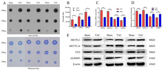 Heart tissue was homogenized using TRIpure Total RNA Extraction Reagent (ELK Biotechnology, Hubei, China; Catalog #EP013), followed by the extraction of total RNA in accordance with the standardized protocol. The RNA was diluted in RNase-free water, denatured at 95 °C for 5 min, and immediately chilled on ice. Subsequently, it was transferred onto a methanol-activated PVDF membrane (Millipore Corporation, Burlington, MA, USA, Catalog #IPVH00010) and crosslinked using UV light for 10 min. The membrane was washed with Wash Buffer for 5 min, followed by blocking with 5% non-fat milk in PBS-T for 1 h at room temperature. It was then incubated overnight at 4 °C with the primary antibody (anti-m6A; Proteintech, Wuhan, China; Catalog #68055-1-Ig). The following day, the membrane was washed three times with 10 mL of Wash Buffer for 5 min each at room temperature, followed by incubation with a diluted secondary antibody in 10 mL of Blocking Buffer for 1 h. Subsequently, the membrane was washed four times with 10 mL of Wash Buffer for 5 min each. The membrane was incubated with the ECL substrate (Aspen Technology, Burlington, MA, USA, Catalog #AS1059) and subsequently visualized through chemiluminescence imaging.