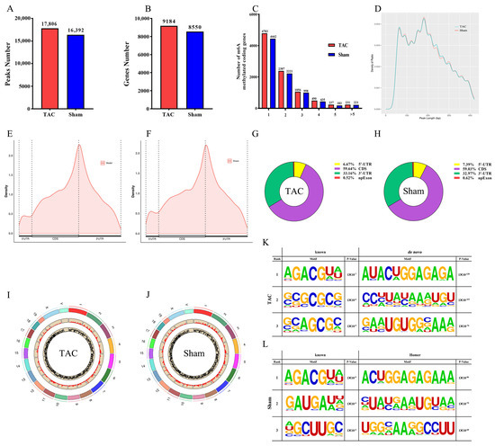 The MeRIP-seq analysis of mRNA derived from mouse cardiac tissue identified 17,806 m6A peaks associated with 9184 genes in the TAC group and 16,392 m6A peaks associated with 8550 genes in the sham group (Figure 3A,B). All m6A methylation modification-related genes were categorized based on the number of m6A peaks associated with each gene. Notably, the majority of m6A-methylated coding genes in the TAC and sham groups existed in only one or two m6A modification sites (Figure 3C). Further analysis of the m6A peak length distribution indicated that the peak length of m6A was primarily concentrated around 200 bp, with no statistically significant difference detected between the TAC and sham groups (Figure 3D). Additionally, the quantitative analysis of genes in each group clearly demonstrated that the m6A modification peaks in the TAC group were significantly greater than those in the sham group. These findings collectively provide robust evidence that the level of m6A modification is markedly increased following TAC.