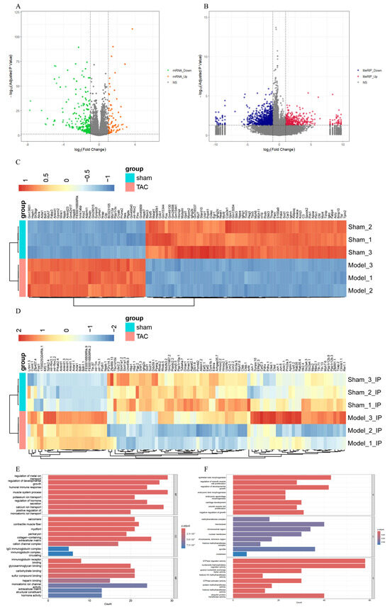 To investigate the transcriptome profiles in the TAC and sham groups, RNA-seq (MeRIP-seq “Input” library) was employed to quantify the levels of DEGs. In comparison with the sham group, a total of 580 genes were identified as differentially expressed in the TAC group (|log2 FC| > 1 and adjusted p-value < 0.05), comprising 156 upregulated genes and 424 downregulated genes (Figure 4A). A heatmap comparing the TAC and sham groups was also generated to visualize the DEGs (Figure 4C). Additionally, comparing with the sham group, a total of 1466 Diffpeaks were identified as differentially expressed in the TAC group (|log2 FC| > 1 and adjusted p-value < 0.05) based on MeRIP-seq analysis, including 717 hypermethylated sites and 749 hypomethylated sites (Figure 4B). A heatmap was also generated to compare the TAC and sham groups, thereby visualizing the differential expression of these Diffpeaks (Figure 4D).