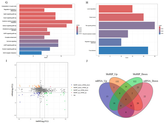 Next, through the integrated analysis of RNA-seq and MeRIP-seq data, all genes were categorized into four distinct groups as follows (Figure 4I): 25 genes with both MeRIP and mRNA downregulation, 1 gene with both MeRIP and mRNA upregulation, 18 genes with MeRIP downregulation but mRNA upregulation, and 22 genes with MeRIP upregulation but mRNA downregulation (Figure 4J).