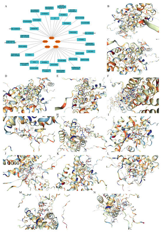 Potential drugs or compounds targeting the six hub genes were identified via an analysis using the DGIdb database, and the drug–hub gene interaction network was visualized with the Cytoscape software. Nevertheless, no potential drugs or compounds specifically targeting the Irf4 gene have been identified to date (Figure 7A). The protein structures of these drugs and hub genes were retrieved from PubChem and UniProt, respectively. However, no related 3D structures were identified for potential drugs and compounds targeting the Hspa1b and CD33 genes (Table 3). The molecular docking simulations were conducted using the CB-Dock2 platform, and spatial 3D structures were generated based on the docking scores (Figure 7B–N).