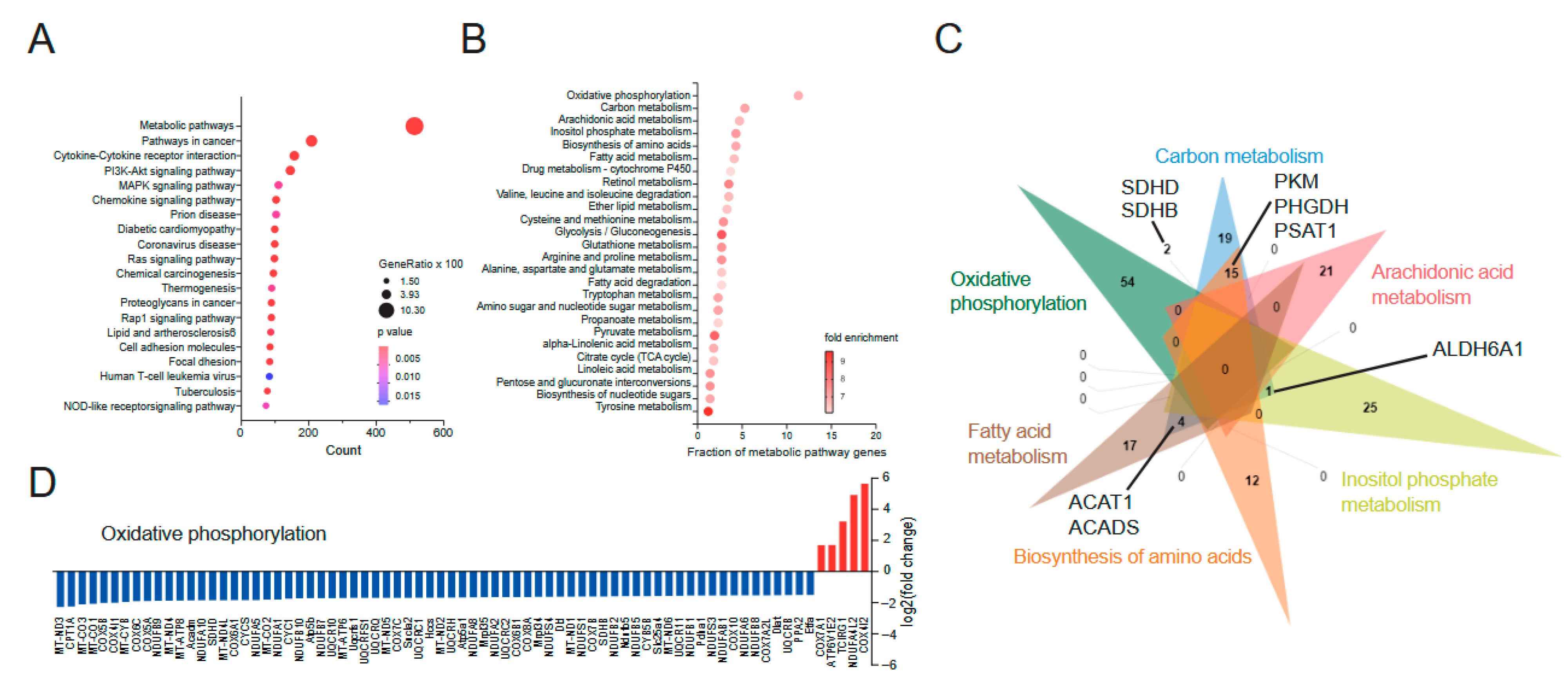 Figure 1. Ulcerative colitis is characterized by a suppression of mitochondrial genes. (A). Identification of altered pathways in human rectal UC biopsies by KEGG pathway term enrichment analysis. Data derives from [23] and was reanalyzed using 5296 significantly altered genes (|fold change| ≥ 1.5, FDR < 0.001) from the comparison of ulcerative colitis (UC) (206 patients) and non-IBD controls (20 patients) stated in supplementary data 1 of [23]. Terms with padj < 0.05 were considered significantly over-represented. The x-axis represents the number of over-represented gene symbols from the input data within stated KEGG terms. Circle size represents the term’s gene ratio (the percent of gene symbols from input data in reference to all gene symbols annotated in a given KEGG term). Color-coding of circles represents the significance of term enrichment (p-value). (B). KEGG metabolic pathway term enrichment analysis of over-represented genes from the ‘Metabolic pathway’ term from (A). X-axis represents the gene ratio of stated KEGG terms. Color-coding indicates fold-enrichment of over-representation. (C). Venn diagram of gene symbols annotated in the top six-fold-enriched metabolic pathway terms of (B). Selected gene symbols annotated within indicated pathways are stated. (D). log2 fold change of up (red)- and downregulated (blue) genes from the KEGG pathway term “Oxidative phosphorylation”, comparing UC patients with age- and sex-matched non-IBD controls [23], identified in (B). (AD). Original RNA-seq data used for re-analyses were published in [23].