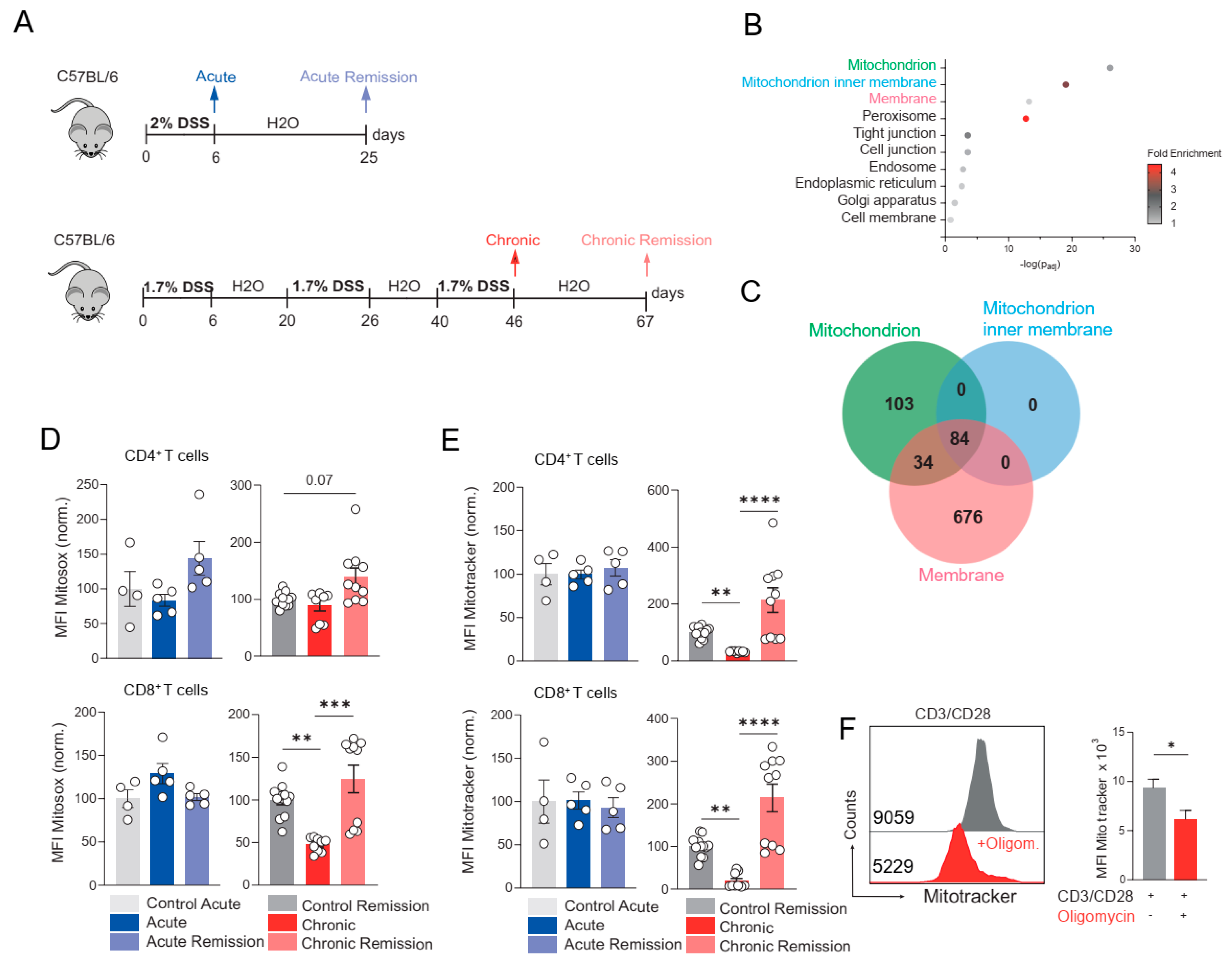 Figure 2. DSS-induced colitis results in decreased mitochondrial function within T cells. (A). Experimental setup for the induction of acute and chronic DSS-induced colitis in C57/BL6 mice. Acute model: Mice receive drinking water infused by 2% DSS for 6 consecutive days following a recovery period of 19 days with normal drinking water. Mice are sacrificed at day 6 (acute) and day 25 (remission of acute). Chronic model: To induce chronic colitis, WT mice received three cycles of 1.7% DSS, respectively, including a 14-day recovery period with drinking water after the first and second treatment cycles (day 46). Mice reach the stage of chronic remission by receiving normal drinking water for further 21 days after the third DSS treatment (day 67). (B). GO Biological pathway analysis of human rectal biopsies of UC patients using 5296 significantly altered genes (|fold change| ≥ 1.5, FDR < 0.001) from the comparison of ulcerative colitis (UC) (206 patients) and non-IBD controls (20 patients) stated in supplementary data 1 of [23]. Terms with padj < 0.05 were considered significantly over-represented. Color-coding represents fold enrichment of statistical over-representation of indicated pathway terms. X-axis shows −log10 (adjusted p value). Terms colored in green, blue, and red represent the top three over-represented terms. (C). Venn diagram of the gene symbol annotations using the top three over-represented terms from (B). (D,E) Lamina propria leukocytes from mouse colons from indicated experimental groups were isolated using enzymatic tissue digestion followed by density-gradient centrifugation. Mice in the six different experimental groups of the DSS model were treated and sacrificed as denoted in (A). (D). Mitochondrial ROS production was determined by Mitosox staining, followed by surface staining with lineage antibodies and subsequent flow cytometric analysis. CD4+ and CD8+ T cells were analyzed for their Mitosox mean fluorescence intensity (MFI). (E). Mitochondrial volume of CD4+ and CD8+ T cells was determined by Mitotracker staining and FACS analyses evaluating the Mitotracker MFI at indicated stages of DSS-induced colitis. (F). Mixed leukocytes from spleen and lymph nodes (cervical, submandibular, brachial, axillary, inguinal, mesenteric) were isolated from untreated wild-type mice, and CD4+ T cells were isolated using magnetic negative selection. Cells were stimulated by agonistic CD3/CD28 (1 µg/mL each) antibodies in the absence and presence of 3 µM Oligomycin for three days. Mitochondrial volume was determined by Mitotracker staining and FACS, analyzing Mitotracker MFI. Left: Representative histogram overlay. Numbers indicate MFI of histogram data. Right: Barplot showing mean ± SEM. Data in (D,E) of young control animals (n = 4); the stages of acute colitis (n = 5) and remission of acute colitis (n = 5) are from one experiment (N = 1). Data from old control animals (n = 12); the stages of chronic colitis (n = 11) and remission of chronic colitis (n = 11) are from two experiments (N = 2). Dots represent individual mice used to prepare cell solutions of the indicated cell subset. Bars and whiskers represent mean ± SEM. Statistical analysis in (D,E) was performed using the Kruskal–Wallis test (H-Test), using values normalized to the mean of control animals. ** p  <  0.01, *** p  <  0.001, **** p < 0.0001. Data in (F) is from one experiment (N = 1) using three individual mice (n = 3) to isolate and stimulate naïve CD4+ T cells. Statistical analysis in (F) was conducted using the unpaired Student’s t-test. * p  <  0.05.