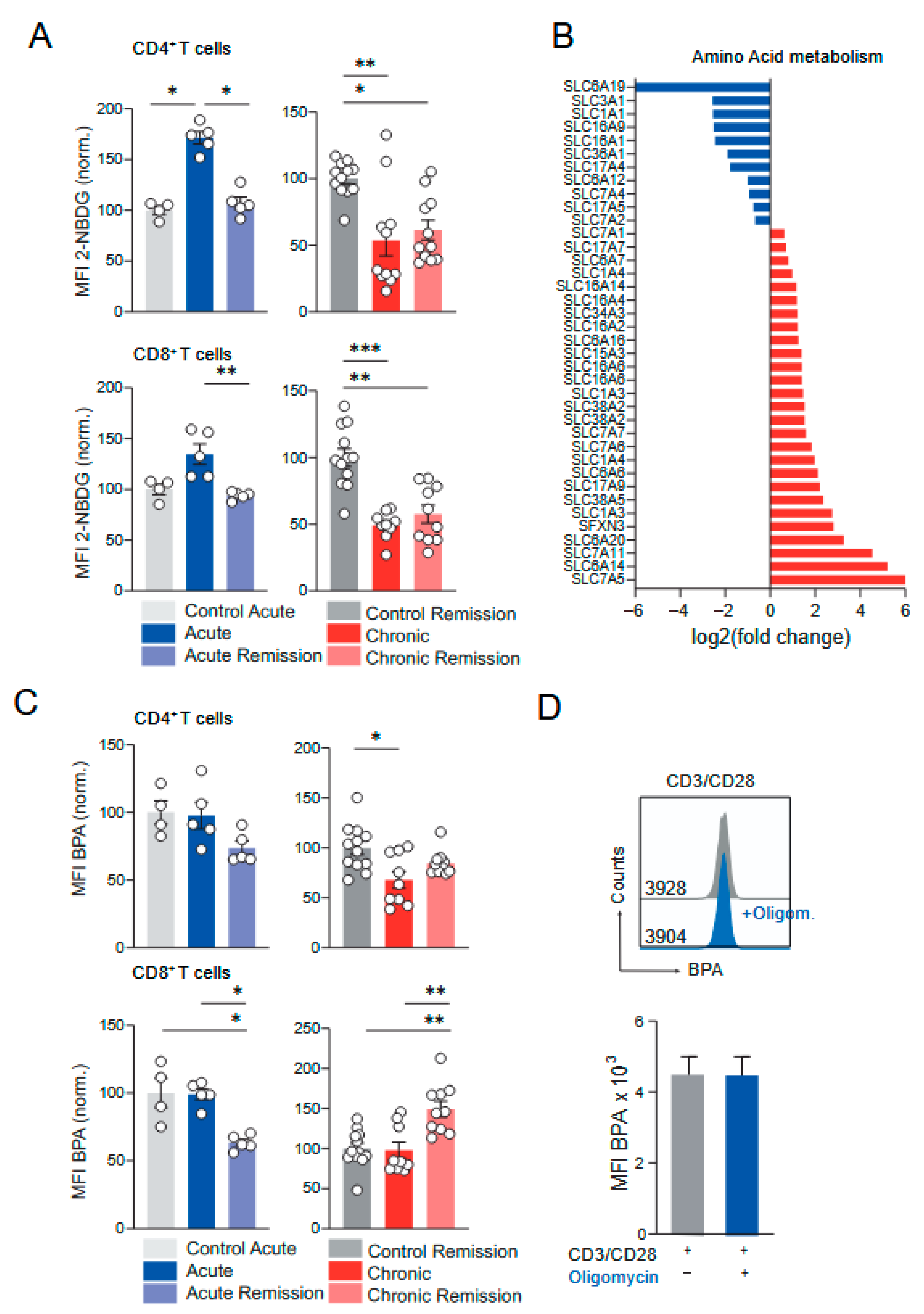 Figure 3. Glucose and amino acid uptake of T cells with mitochondrial depression from different stages of DSS-induced colitis. (A,C) Mice from the six different experimental groups of the DSS model were treated and sacrificed as denoted in Figure 2A. Lamina propria leukocytes were isolated using enzymatic tissue digestion followed by density-gradient centrifugation. (A). Glucose uptake was determined by 2-NBDG assay. For cell subset identification, cells were surface stained with lineage antibodies and subsequently analyzed by flow cytometry. Gated CD4+ and CD8+ T cells, were analyzed for their MFI of 2-NBDG fluorescence intensity. (B). Re-analysis of RNAseq data from human rectal biopsies of IBD patients. Identification of altered up- (red) and downregulated (blue) genes related to amino acid metabolism visualized as log2 (fold change). (C). Amino acid uptake was determined using BPA assay followed by cells lineage antibody staining and flow cytometric data acquisition. Gated CD4+ and CD8+ T cells were analyzed for their MFI of BPA fluorescence intensity. (D) Mixed leukocytes from spleen and lymph nodes (cervical, submandibular, brachial, axillary, inguinal, mesenteric) were isolated from untreated wild-type mice, and CD4+ T cells were isolated by magnetic negative selection. Cells were stimulated by agonistic CD3/CD28 (1 µg/mL each) antibodies in the absence and presence of 3 µM Oligomycin for three days. Aminoacid uptake was determined by BPA and measured by flow cytometry for the indicated groups MFI. Left: Representative histogram overlay. Numbers indicate MFI of histogram data. Right: Barplot showing mean ± SEM. Data in (A,C) for young control animals (n = 4, respectively, n = 5 for IECs) and the stages of acute colitis (n = 5) and remission of acute colitis (n = 5) are from one experiment (N = 1). Data from old control animals (n = 12) and the stages of chronic colitis (n = 11) and remission of chronic colitis (n = 11) are from two experiments (N = 2). Dots represent individual mice used to prepare cell solutions of the indicated cell subset. Statistical analysis was performed by the Kruskal–Wallis test (H-test) using values normalized to the mean of young and old control animals. * p  <  0.05, ** p  <  0.01, *** p  <  0.001. (D) Data is from one experiment (N = 1) using two individual mice (n = 2) to isolate and stimulate naïve CD4+ T cells.