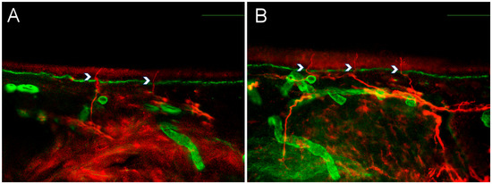 Using indirect immunofluorescence, intraepidermal innervation was assessed with the pan-neuronal marker PGP9.5. Biopsies were fixed for 24 h at 4 °C in Zamboni’s fixative, then were cryoprotected overnight with a solution containing 30% (v/v) ethylene glycol and 30% (w/v) sucrose in phosphate-buffered saline with 1% polyvinylpyrrolidone (PVP). A cut was performed at −23 °C with a cryostat (MEV, SLEE medical GmbH, Nieder- Olm, Germany) to obtain 50 µm-thick sections. Three non-consecutive free-floating sections were randomly selected for immunostaining from each sample and blocked with 5% normal donkey serum for 1 h. Sections were then incubated overnight with a rabbit anti-human PGP9.5 monoclonal antibody (Abcam, Cambridge, UK, 1:500 diluted) and a mouse anti-human collagen IV monoclonal antibody (Millipore, Darmstadt, Germany, 1:1600). The following day, sections were incubated with anti-rabbit-Cy3 (Jakson ImmunoResearch, Cambridgeshire, UK, 1:800) and anti-mouse-488 (Jakson ImmunoResearch, Cambridgeshire, UK, 1:400) secondary antibodies overnight.