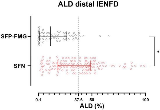 In the analysis conducted to differentiate ALD values between patients with FMG-SFP and SFN, we included only patients who had abnormal IENFD. This approach was deemed more appropriate, as it allows for a comparison between two patient populations with distinct clinical conditions but a shared skin biopsy abnormality.