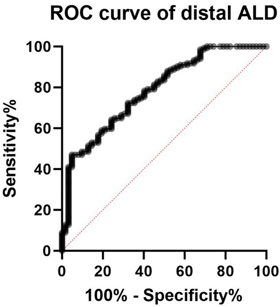 The ROC curve analysis showed an AUC of 0.81 (95%CI 0.74 to 0.87, p < 0.0001) (Figure 3). According to the maximized Youden index, at the distal site an ALD value of 37.6% was the optimal threshold to discriminate between the two groups, with a specificity of 91% (95%CI 0.818 to 0.958) and a sensibility of 50% (95%CI 0.412 to 0.587), with 0.91 positive (95%CI 0.82 to 0.96) and 0.46 negative predictive value (95%CI 0.38 to 0.55).