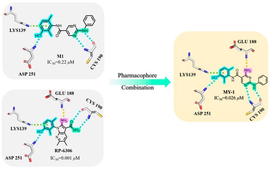 In our compound library, M1 exhibited moderate kinase inhibitory activity (IC50 = 0.22 μM). Comparative molecular docking against the Phase II clinical candidate RP-6306 revealed near-identical binding modes at the DFG motif, where both compounds established hydrogen bonds with Asp251 and π–cation interactions involving Lys139. Within the hinge region, both engaged Cys190 via H-bonding. Crucially, RP-6306 established an additional H-bond with Glu188 through its amino group—a feature absent from M1—which mechanistically accounted for their 8.3-fold potency difference. Consequently, pharmacophore fusion was employed to introduce an amino group into M1, reinforcing hinge-region anchoring. This optimization yielded MY-1 with significantly enhanced inhibitory activity (IC50 = 0.026 μM).