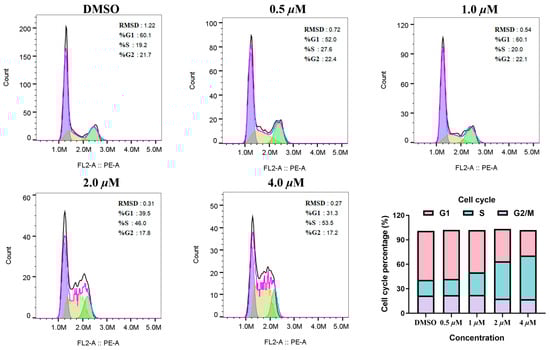 HCC1569 cells (1 × 105/well) were seeded in 6-well plates and cultured for 24 h at 37 °C under 5% CO2. MY-14 at varying concentrations were added, followed by 5-day incubation. Cells were trypsinized, pelleted by centrifugation, and fixed with 70% ethanol. Subsequent staining was performed with propidium iodide (PI) and RNase A according to the Beyotime kit protocol. After 30 min incubation at 37 °C, samples were analyzed by flow cytometry.