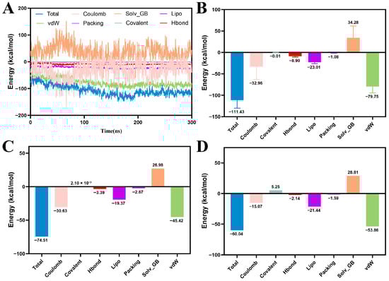 MM/GBSA Analysis of Protein-Ligand Complexes. (A) MM/GBSA energy variation over 300 ns MD simulation for PKMYT1-MY-14. (B) Histogram of MM/GBSA binding energy components for PKMYT1-MY-14. (C) Histogram of MM/GBSA binding energy components for PKMYT1-RP-6306. (D) Histogram of MM/GBSA binding energy components for PKMYT1-M1.