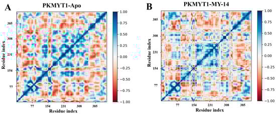 DCCM analysis for PKMYT1. (A) DCCM map of apo-PKMYT1 illustrating correlated motions in the absence of ligand. (B) DCCM map of the PKMYT1-MY-14 complex. Intensity of blue correlates with positive motion coupling; intensity of red indicates negative motion coupling. White regions denote no significant correlation.
