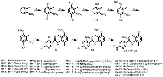 All compounds were synthesized according to the following route. As shown in Scheme 1, 2,6-Dimethylnitrobenzene underwent an electrophilic substitution reaction with bromine to yield T-1, which was treated with sodium methoxide under basic conditions via nucleophilic substitution, yielding intermediate T-2. Demethylation of T-2 using boron tribromide afforded T-3, followed by tert-butyldimethylsilyl (TBS) protection under basic conditions to produce T-4. Subsequent reduction with iron/ammonium chloride generated intermediate T-5. Condensation of T-5 with acyl chloride resulted in intermediate T-6, which underwent nucleophilic substitution with aqueous ammonia under basic conditions to afford T-7. Final coupling with various aniline derivatives provided target compounds MY-1 to MY-21.