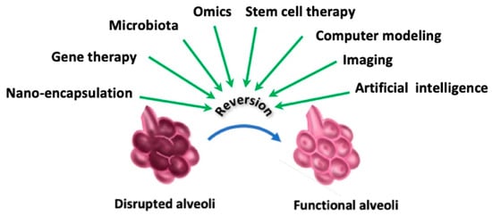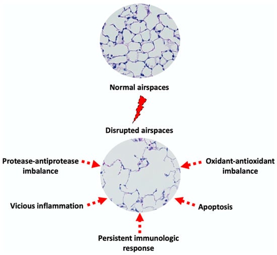 Regarding this latter, this is an irreversible process that results in impaired gas exchange. Another parameter that plays a significant role in this process is the disruption of mechanical forces [37,38]. These latter include stretching, recoil, and tension that allow mechanical stability and maintain alveolar wall structure and function. Of importance as well, the signaling mediated by these forces contributes to regulate cell behavior in terms of survival, proliferation, and repair. Such disruption highly likely contributes to airspace enlargement through the above-mentioned mechanisms [39,40]. Moreover, the nonuniform lung tissue damage leads to the generation of “stress concentrations zones” and compensatory overexpansion (by remaining alveoli), both of which lead to additional mechanical strain and perpetuate the cycle of damage and progressive airspace enlargement.