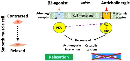 These medications stimulate β-2 adrenergic receptors leading to the relaxation of the smooth muscles surrounding the airways (Figure 3). This results in the dilation of the conducting airspaces, making it easier for air to move in and out of the lungs. Briefly, β-2 agonists specifically bind to and activate G-protein-coupled receptors that in turn trigger the stimulation/activation of a series of enzymes. These include adenylyl cyclase, which converts ATP to cyclic AMP (cAMP). Increased cAMP will then activate protein kinase A. This latter phosphorylates various targets, resulting in the inhibition of myosin light-chain kinase and reductions in intracellular calcium and hence the relaxation of smooth muscle cells and airway dilatation. Short-acting β-2 agonists such as albuterol or salbutamol and levalbuterol are often used for quick relief from acute symptoms and are commonly referred to as “rescue inhalers”. However, long-acting β-2 agonists (LABAs) (e.g., salmeterol and formoterol) provide a more prolonged bronchodilator effect and are often used as maintenance therapy to prevent symptoms [78]. Newly developed LABAs such as indacaterol are now suitable for once-daily administration (Table 4) [79,80,81].