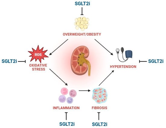 The figure shows the nephroprotective mechanisms offered by SGLT2is. The middle of the figure represents the pathogenetic interplay involved in chronic kidney disease (overweight/obesity; oxidative stress; inflammation; fibrosis; and hypertension). The outer regions represent the inhibition signals conveyed by SGLT2is on all these specific processes of kidney damage.