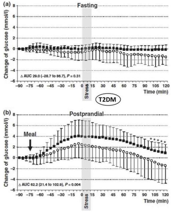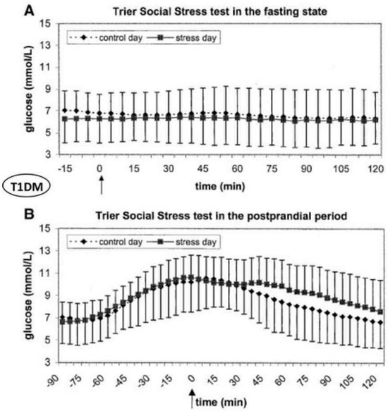 Studies using the Trier Social Stress Test (TSST) in people with Type 1 Diabetes Mellitus (T1DM) found no glucose changes in the fasting state but significantly delayed glucose decrease in the postprandial period (see Figure 2) [56].